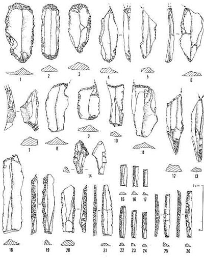 Industrie lithique : Périgordien évolué ou Proto-Magdalénien ( N° 1 à 3 : grattoirs sur lame ; N° 4 à 6 & 13 : burins dièdres ; N° 7 : burin busqué atypique ; N° 8 : pseudo burin à bec de perroquet ; N° 9 à 12 : burins sur troncature retouchée ; N° 15 à 17 & 22 à 26 : lamelles à dos épais bitronquées ; N° 19 à 21 : lames à dos abattu de style "Gravette") (Dessins de N. Champagne.)