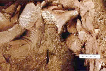 A remarquer d'une part, couche J, plusieurs centaines de vertèbres de poissons qui nous rappellent que la Dordogne est située à 5 km des Fieux et que nos hommes du Paléolithique n'étaient pas seulement des chasseurs mais aussi des pêcheurs (saumon, truite).