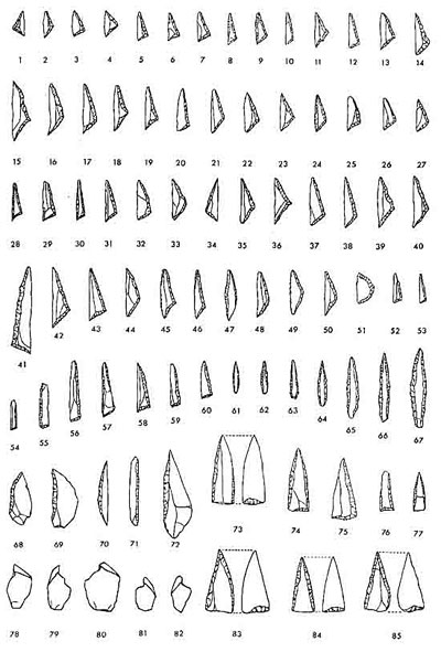 Industrie lithique sauveterrienne (N° 1 à 60 : microlithes géométriques ; N° 61 à 67 : pointes de Sauveterre ; N° 73 à 75 & 83 à 85 : pointes de Tardenois ; N° 78 à 82 : microburins